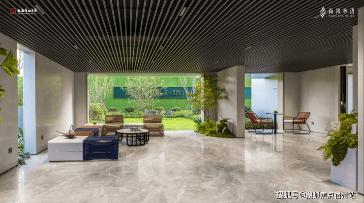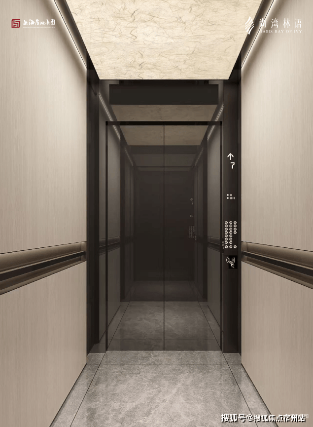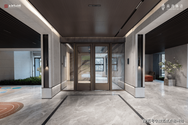 进入内部是灰色大面铝板搭配金色格栅,电梯厅墙面则铺设大面积岩板,吊顶也颇具设计感.